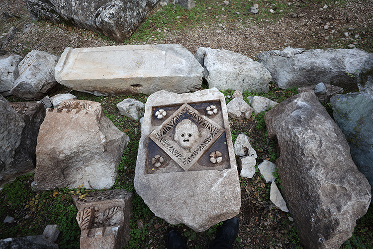 Dans eden kadın figürleriyle süslü anıt mezardan bir taş blok üzerinde tiyatro maskesi kabartması. Bu özgün taş, mezarın dijital rekonstrüksiyonunda kullanılan ana mimari elemanlardan biri. Fotoğraf: Süleyman Elcin/AA